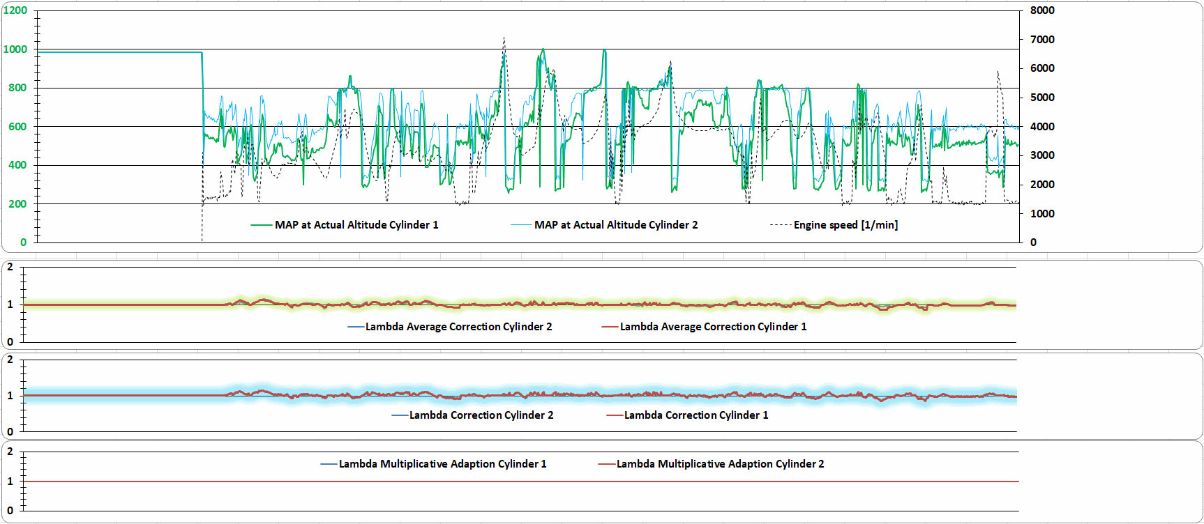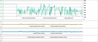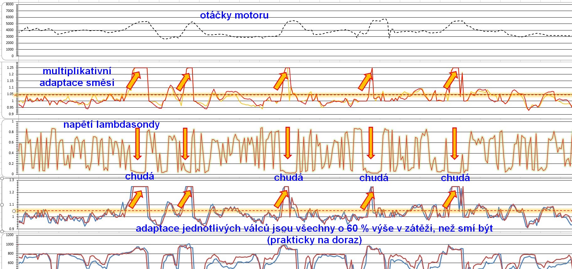 Záznam z logu jasně ukazuje, že motocykl bojuje s nedostatkem paliva při každé akceleraci, nejen když motorka cuká nebo nemá výkon. Symptom není potřeba vyvolat, z grafu je to i tak jasné, i když cukat nezačne: "Problém je v nedostatku benzínu v plné zátěži."